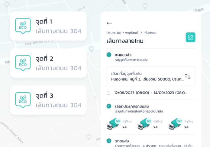 โดยผสานรวมระบบ TMS (Transport Management System) ในการบริหารจัดการข้อมูลและงานโอเปอเรชั่น และ VRP (Vehicle Routing Planning) ที่ใช้เทคโนโลยี AI ในการคำนวณเส้นทางการขนส่งอัตโนมัติ ช่วยลดต้นทุนการดำเนินงาน ลดระยะเวลาเดินทาง ลดอัตราการสูญเสียพลังงาน และเพิ่มประสิทธิภาพในการขนส่ง